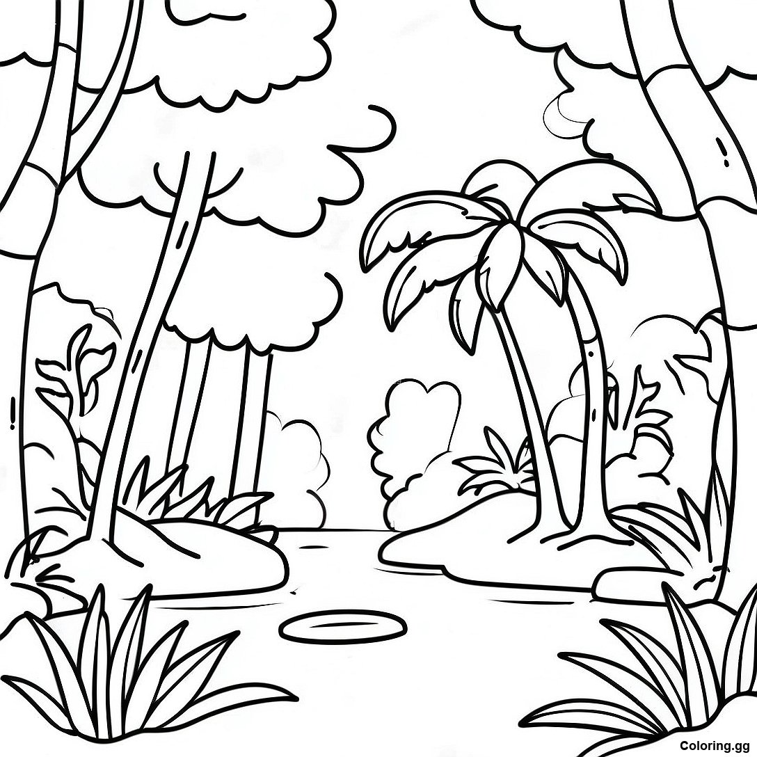 下载 郁郁葱葱的热带雨林涂色页 的可打印 PDF